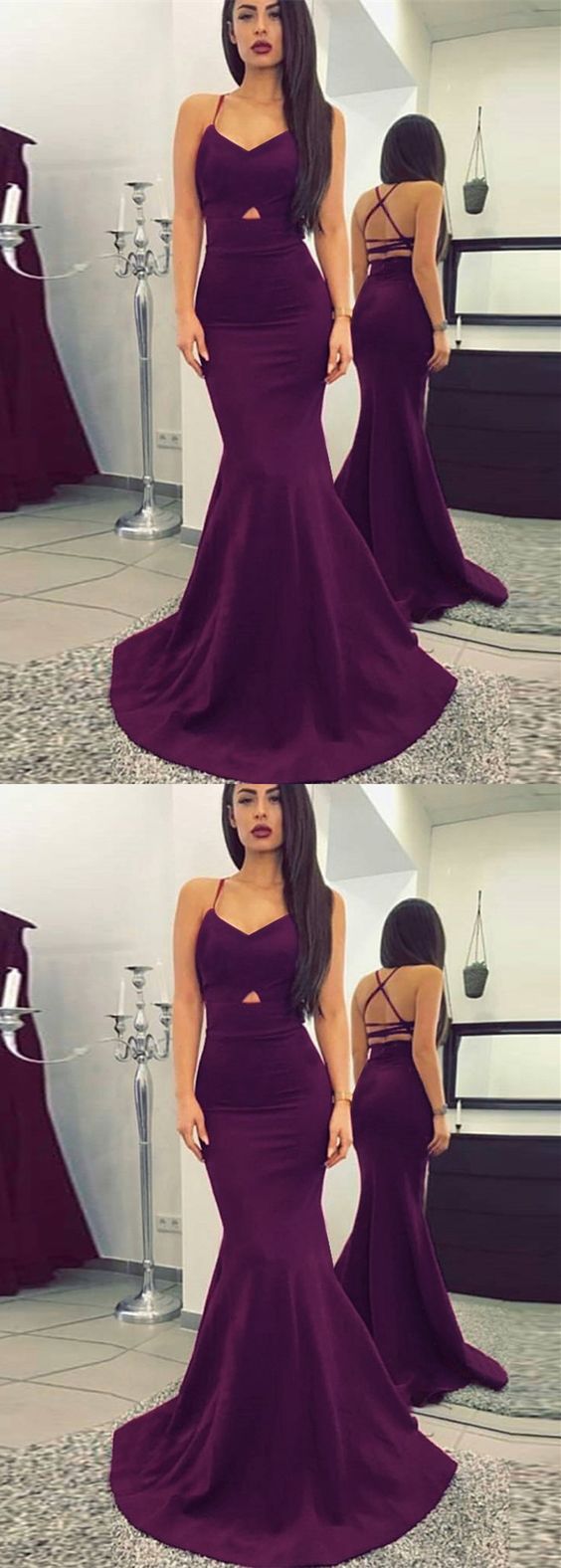 Mermaid V-Neck Criss-Cross Straps Sweep Train Purple Prom Dress , Sexy Satin Evening Formal Gowns