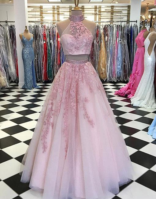 Pink two pieces lace tulle long prom dress, pink evening dress