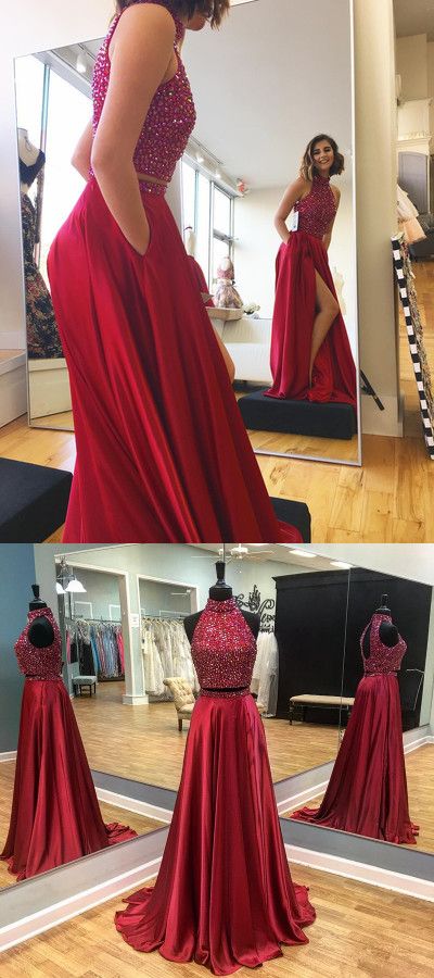 Sparkly Beaded Prom Dress, Sexy Burgundy Prom Dresses with Slit, Long Evening Party Dress