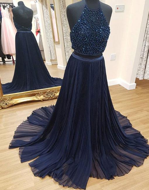 Dark blue two pieces long prom dress, formal dress