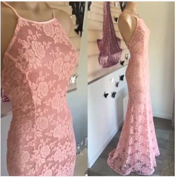 Mermaid Open Back Pink Lace Evening Dress,High Quality Lace Prom Dress,Sexy Mermaid Spaghetti Straps Pink Lace Formal Party Dress