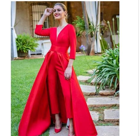 Elegant Red Satin Jumpsuits Evening Dresses Floor Length Prom Dress Custom Long Sleeves Backless Party Formal Gown robe de soiree