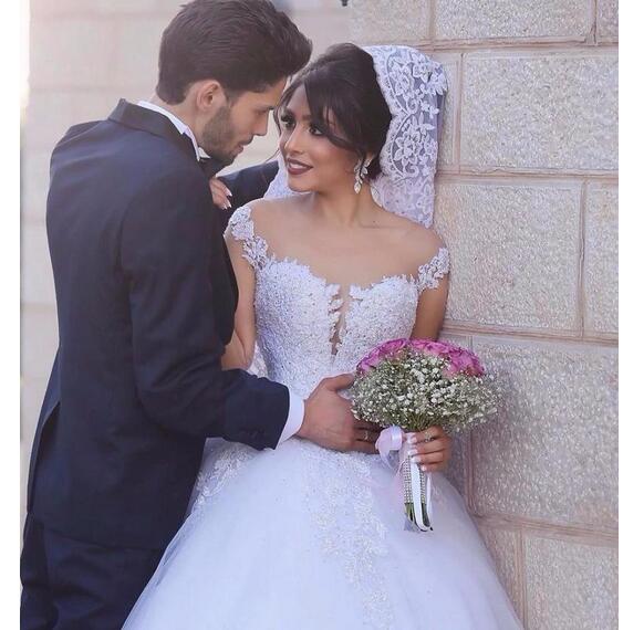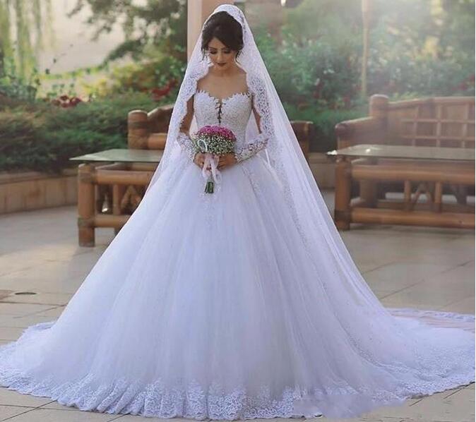 Luxury Princess Ball Gown Wedding Dresses Sheer Illusion Neck Long Sleeves Chapel Train Lace Wedding Bride Dresses Robe de mariee