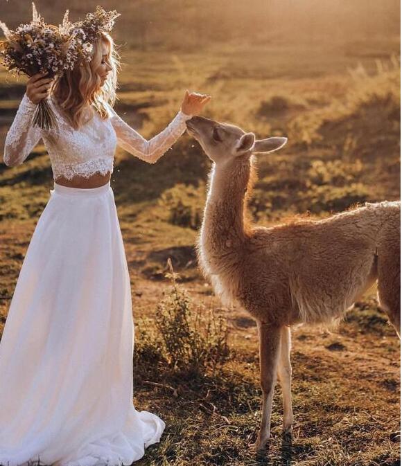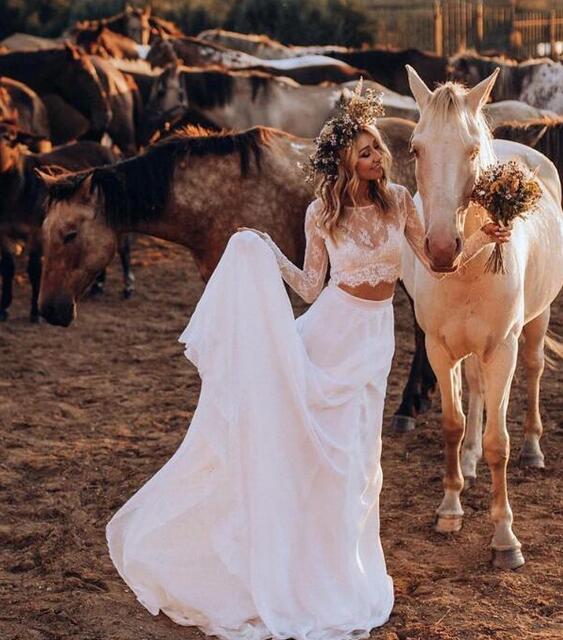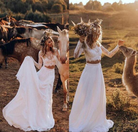 Two Pieces Country Boho Wedding Dresses 2020 A Line Long Sleeve Lace Applique Bohemian Wedding Gowns Custom Made Beach Bridal Dress