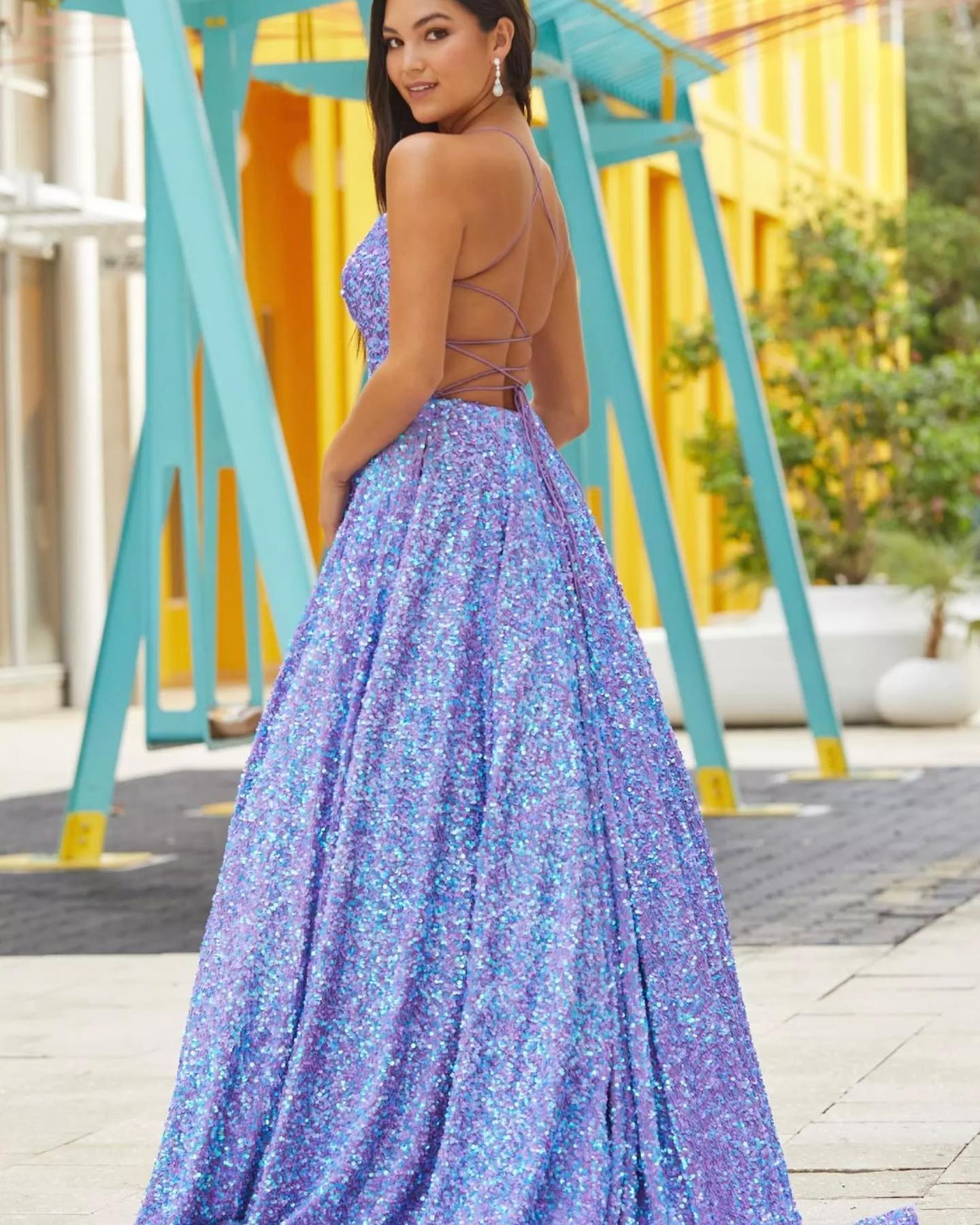 Purple A Line Sequins Lace Prom Dress Evening Dress