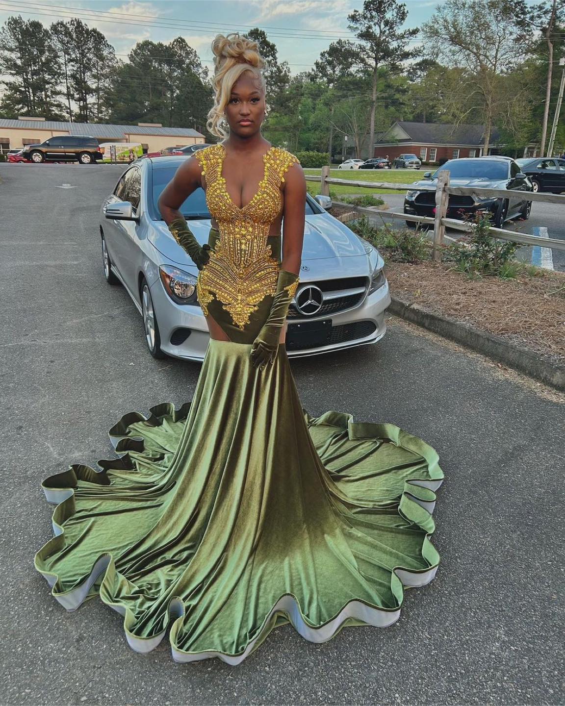 Green Mermaid Gold Appliques African Prom Dress Evening Dress
