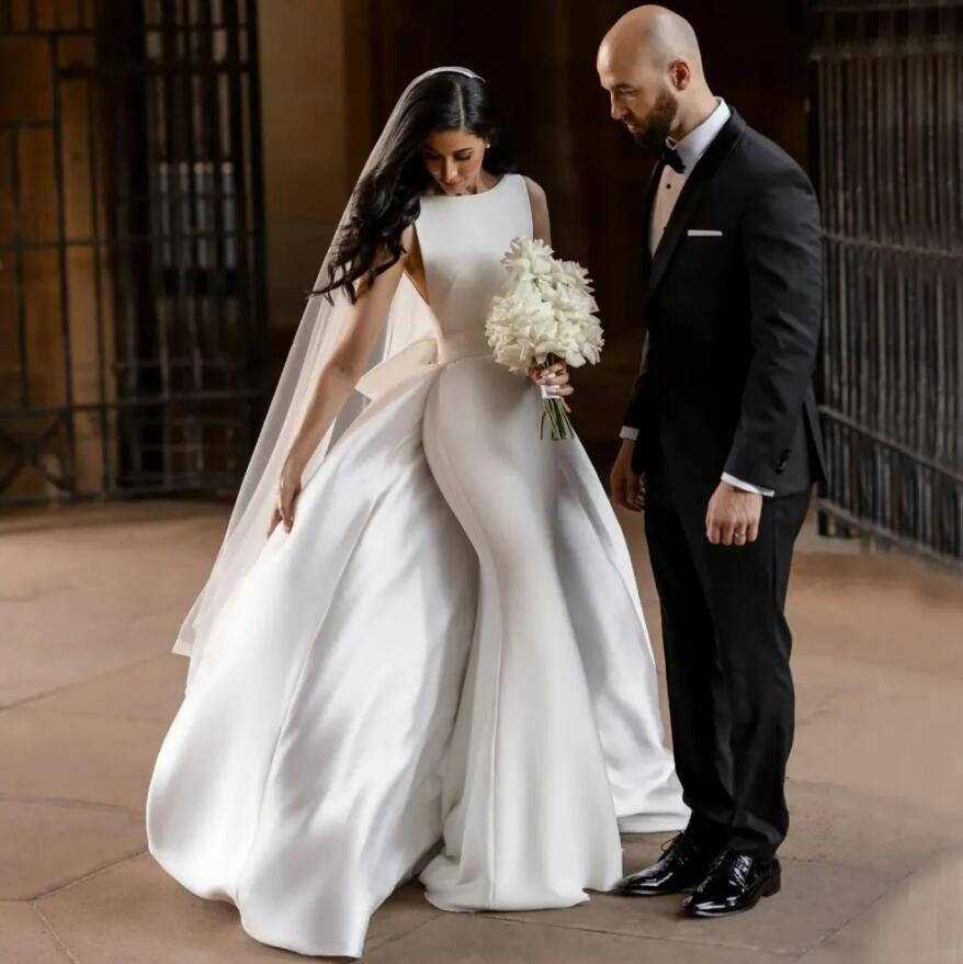 Stunning Mermaid Wedding Dresses Backless Bridal Gowns Bateau Neckline With Detachable Train Satin Plus Size Vestido De Novia