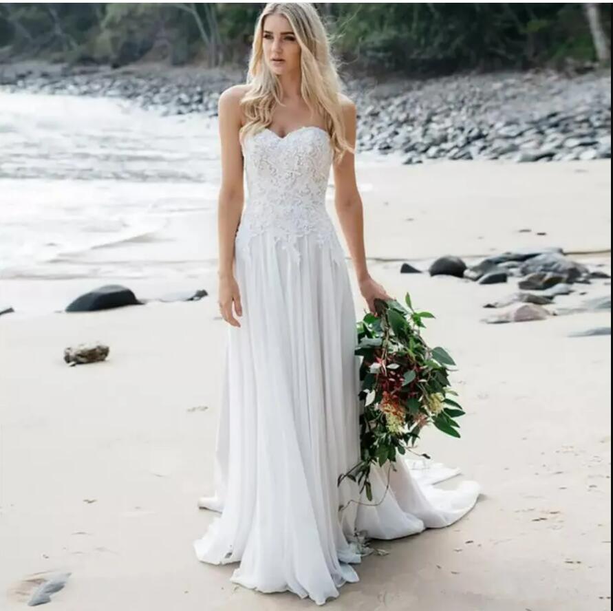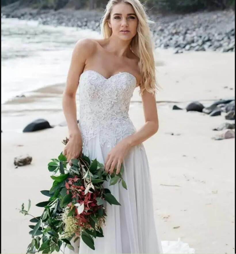 Strapless Fitted Waist A-line Wedding dresses With Soft Flowing Chiffon Skirt With Train Delicate Lace