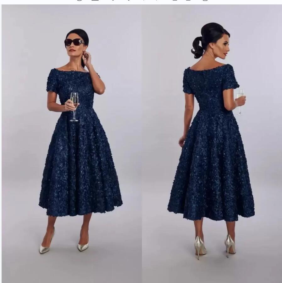 Elegent House Of Mooshki Mother of The Bride Dress Short Sleeve Applique Crystal Ruched Wedding Guest Dresss Tea Length Evening Gown