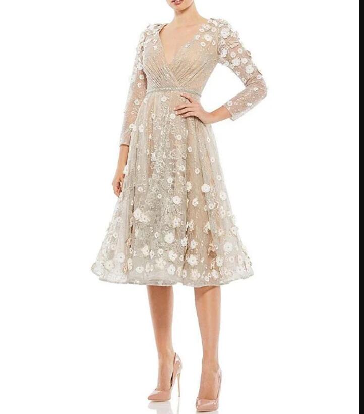 Light Champagne Lace Mother of Bride/Groom Dress Sheer 3/4 Long Sleeve Tea-length Prom Dress