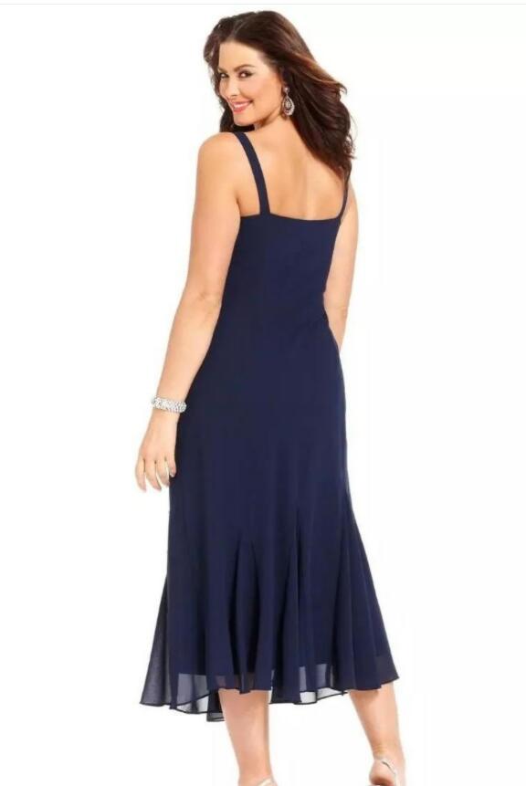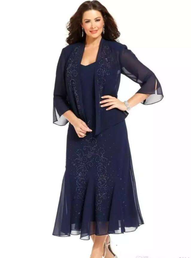 Navy Blue Chiffon Tea Length Mother of the Bride Dresses with Jacket 3/4 Long Sleeves Beaded Plus Size Mother Groom Formal Evening Wear